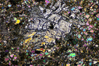 Tremolite alters to talc and to chlorite. In the above image, talc borders tremolite on the top and right edges of the bladed portion (granular mineral with very high birefringence), and also forms small clots below it and to the left. Rounded mineral grains around periphery of image are olivine. Pyroxene (gray) is at right, and mica (red) is at left. XPL. Imaged area 2.7 mm x 4 mm.